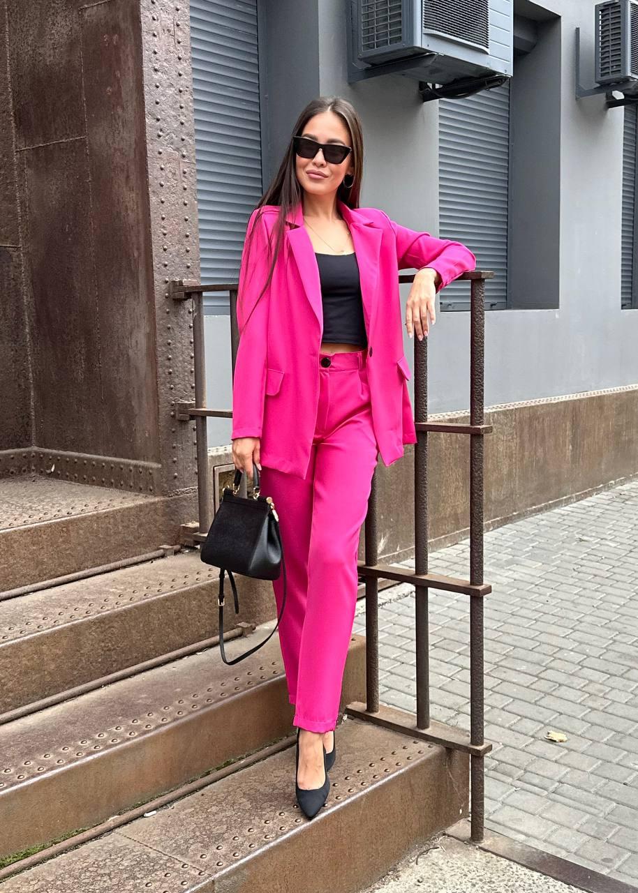 У комплект входять піджак довжиною 69 см та штани з високою посадкою довжиною 95 см.